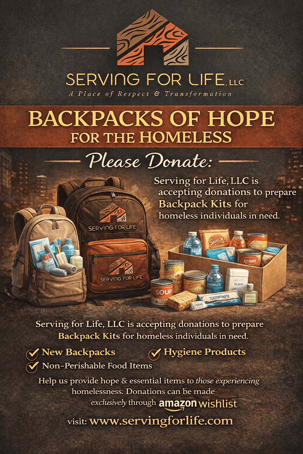 Join Serving for Life as we collect and distribute stuffed backpacks for the homeless. We are collecting the following items for the homeless population.